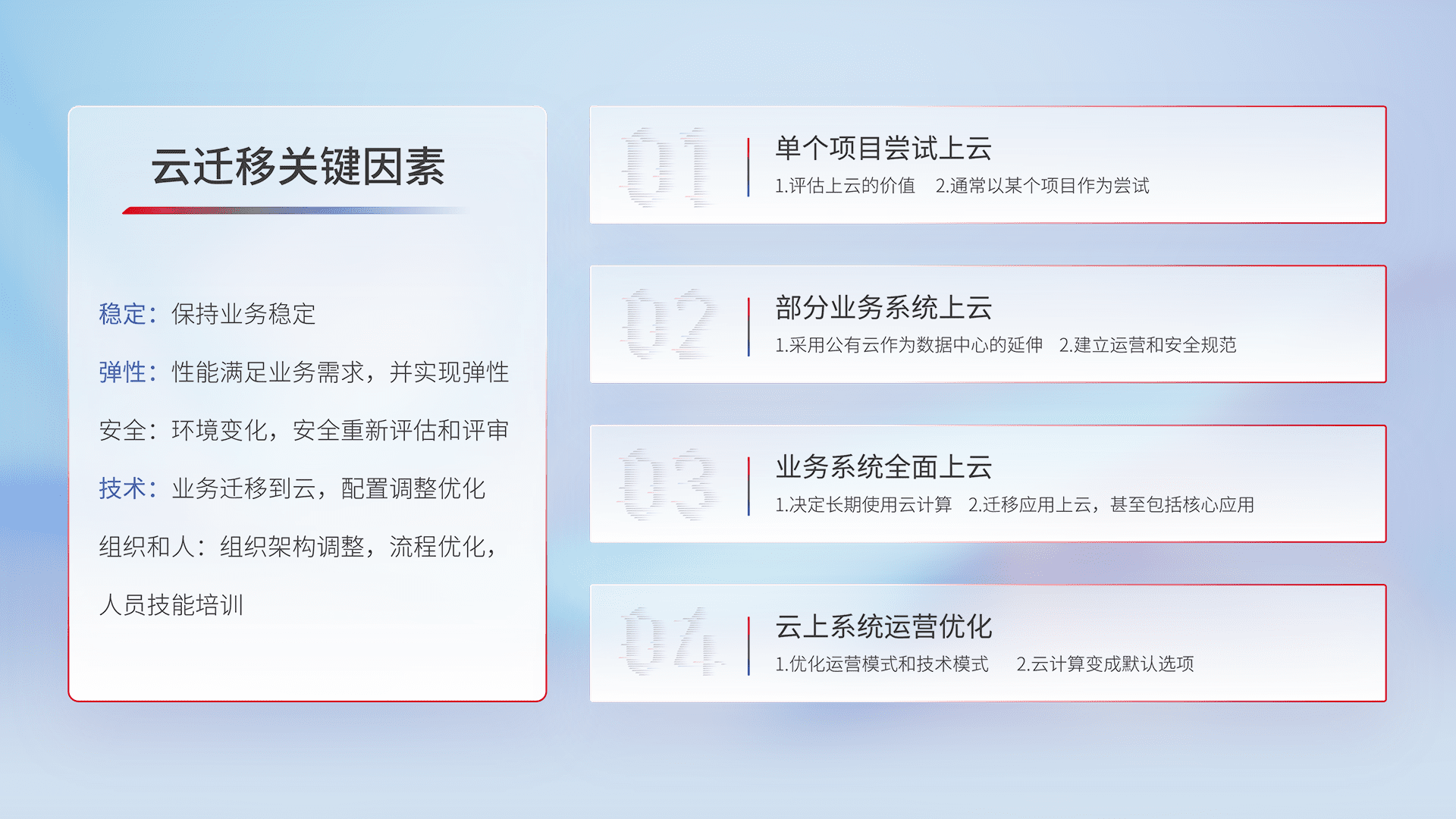 结合实际业务,,,,从规划设计、、云平台选型、、、、云原生改造、、、数据迁移、、集成交付,,迁移全过程为客户识别最佳上云路径,,,做好风险识别管理,,设计网络架构、、、、身份权限、、、安全审计合规、、、操作审计、、、、日志审计、、、监控告警策略、、多站点容灾设计等,,对云上基础设施进行整体规划,,,,提升IT治理水平,,,,以满足弹性、、高可用、、、、高性能的需求。。。。