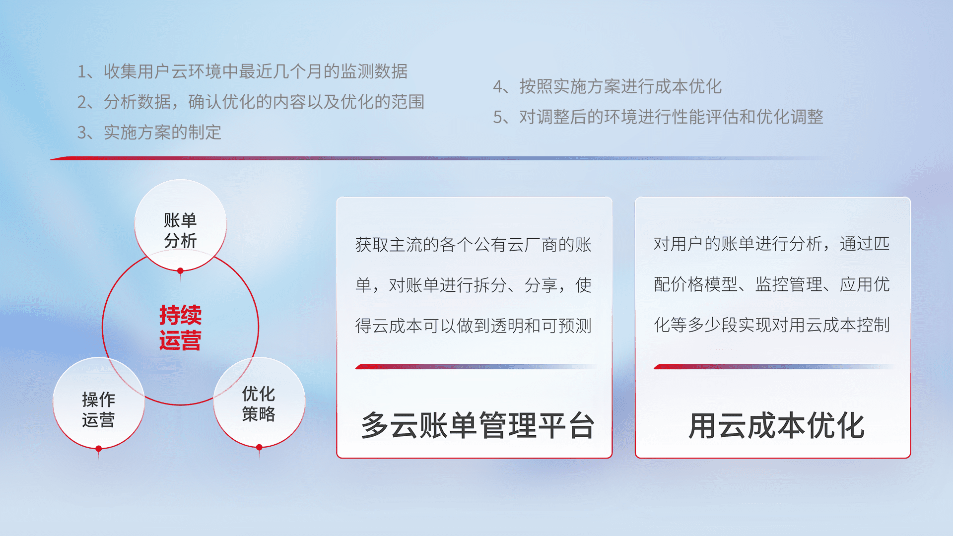 通过多云纳管,,以统一的资源数据模型把客户的云资源进行抽象和封装,,进而实现对多云资源的统一操作,,保障云资源管理的可靠性、、稳定性与可用性。。。量身定制化运维内容,,,配置、、、开发运维、、、、补丁管理、、备份、、、、监控、、、认证和访问管理、、审计和日常巡检等,,保障在用云过程中的可靠度,,,,稳定度以及高可用率。。。