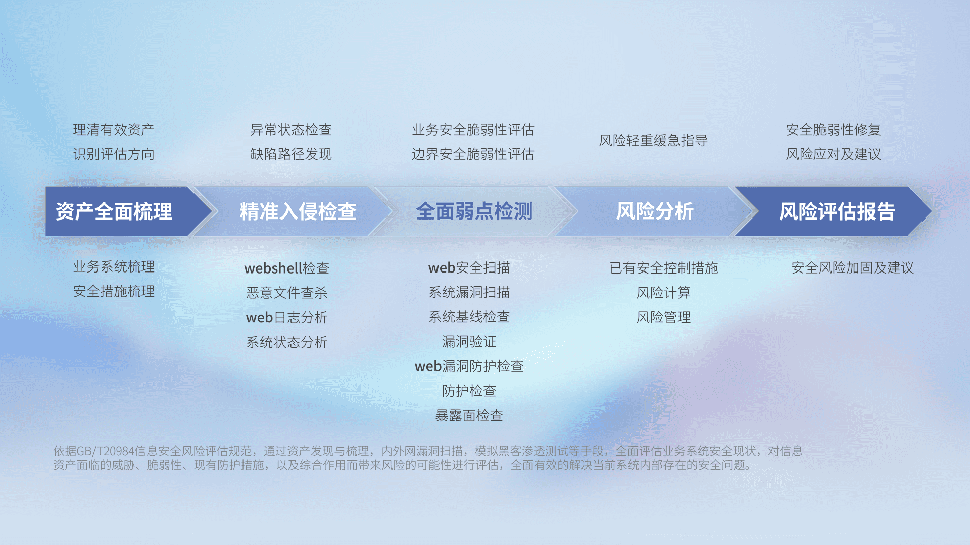 针对客户行业特性,,以专业的安全服务+多厂商联合解决方案提供专属的一站式安全管理服务,,,,帮助客户全面感知网络空间威胁,,基于识别、、、、检测、、、、分析、、、防护、、监测、、响应的服务理论模型,,,从方案咨询、、集成交付、、评估验证、、、优化加固、、、、运维运营,,,致力于为客户提供完整的闭环管理式安全服务。。。以实战经验为客户打造高抵御风险的安全体系,,,,帮助客户发现威胁、、、、对抗威胁、、、处置威胁,,,不断积累安全对抗能力,,,持续保障数字化安全。。。。